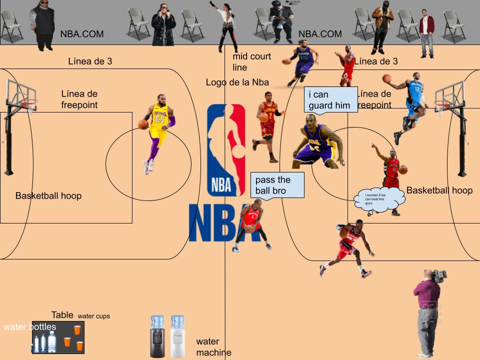 Mientras el juego de baloncesto esta en progreso, se pueden ver varios artistas. Como: Stevie Wonder, Bad Bunny, Michael Jackson, Jory Boy, Anuel AA y Drake viendo el juego. Lebron James y otros jugadores de baloncesto están jugando y al final se puede ver un camarógrafo. Se puede ver a Dwight Howard en proceso de donquear una bola. Kawhi Leonard le pide a Kyrie Irving para que le pase la bola. El arbitro se asegura de poner la mesa con las botellas de agua al final a la izquierda. Dennis Rodman se ve que quiere defender a la persona en su frente. John Wall se pregunta si podrá vencer a Lebron James y su equipo. Michael Jackson se ve que esta disfrutando el juego de baloncesto. Anuel AA esta triste que su equipo esta perdiendo.